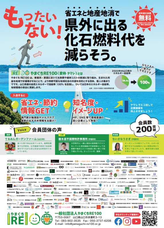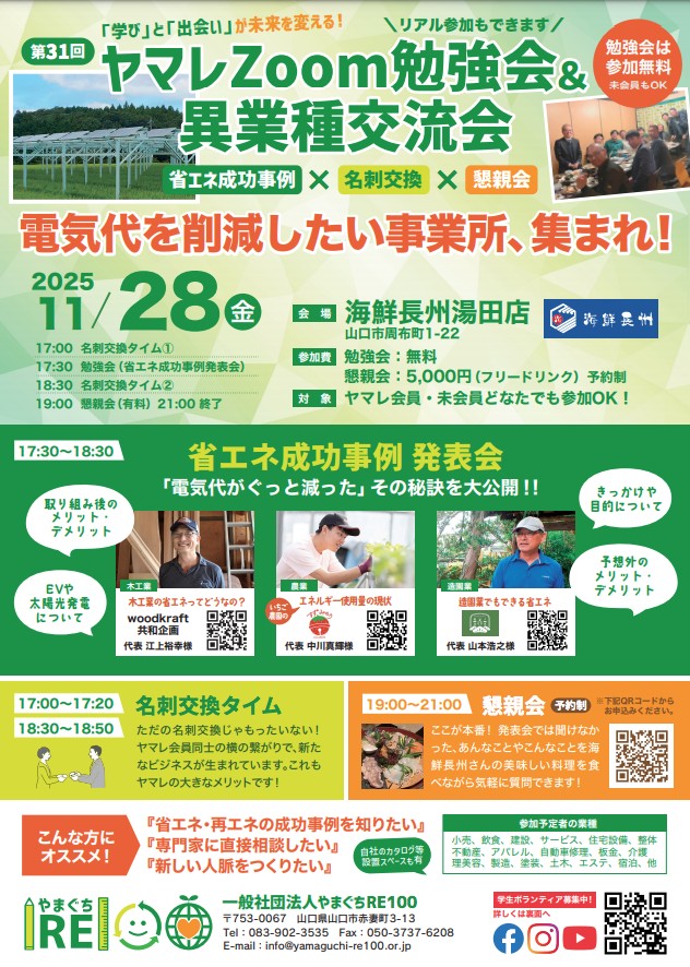 環境やまぐち推進会議事務局から、一般社団法人やまぐちRE100が行う省エネ成功事例発表会の開催案内がありましたのお知らせします。